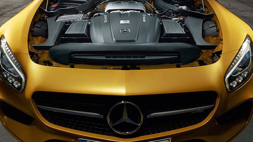 As soon as you climb into the Mercedes-AMG GT you are filled with the exciting sensation of driving a unique sports car. Materials, colours and styling add up to an impressive whole, which delights with its pure sporty appeal and an exclusive sensuality that makes it truly stand out. From the AMG Performance steering wheel in nappa leather and the AMG instrument cluster with carbon-fibre-effect backplates to the sculptural lines of the instrument panel, every interior element contributes to the car’s overall compelling appeal. High Performance engine – the newly developed AMG 4.0-litre V8 biturbo engine.