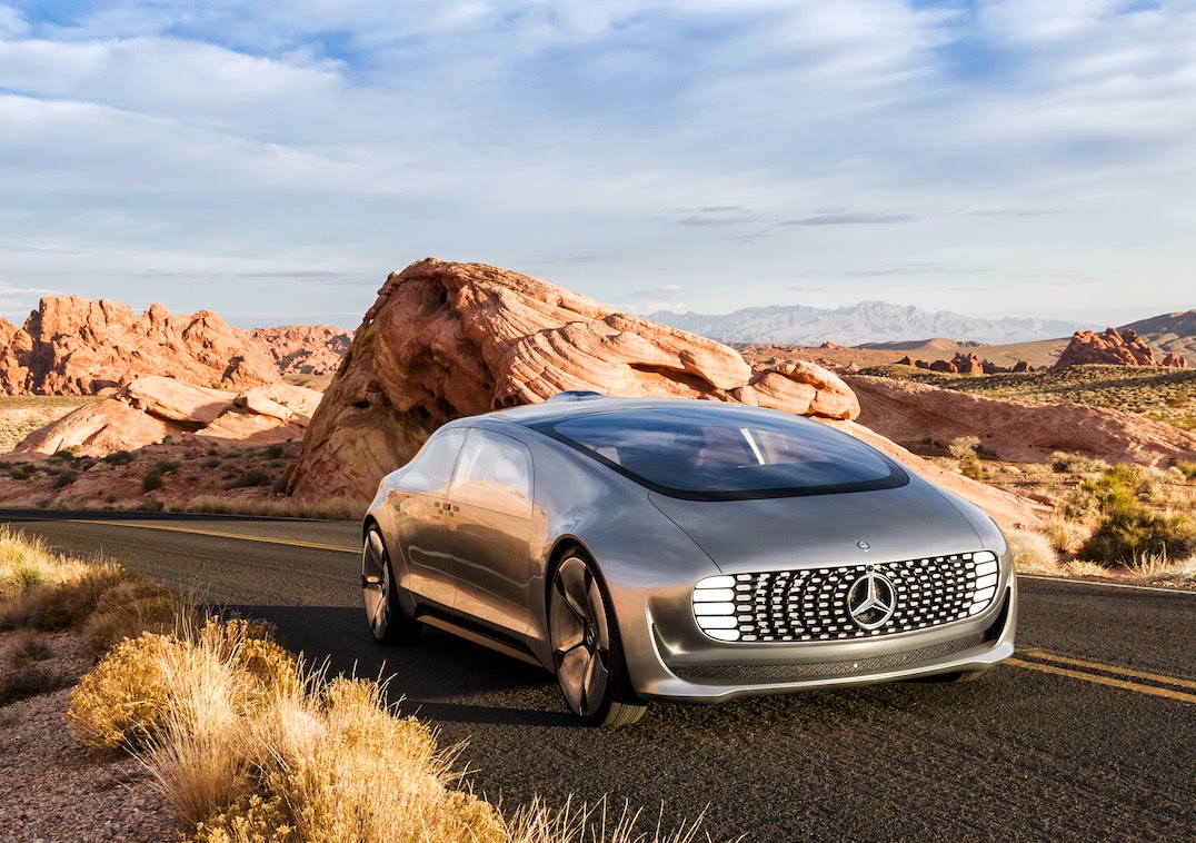The F015 is a sort of collage of futuristic technological concepts. The smooth, pod-like car is driven by a fuel cell hybrid powertrain that powers the car (on paper at least) up to 684 zero-emission miles (1,100 km), 560 (900 km) of these on fuel cell-derived electricity and 124 (200 km) on battery power. Mercedes gives no indication as to what specific combination of batteries, fuel cells and motors supports that lofty claim, though.